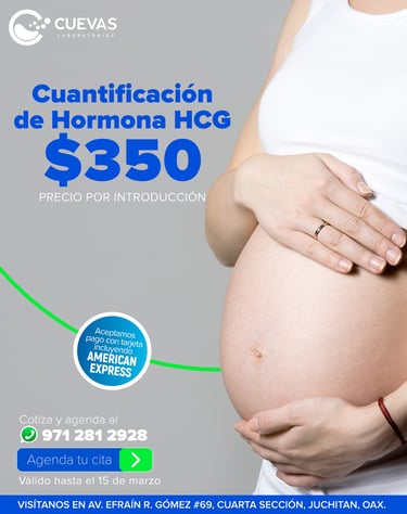 En Cuevas Laboratorios ofrecemos la prueba de embarazo mediante la determinación de la hormona HCG (gonadotropina coriónica humana), un análisis clínico confiable que permite confirmar la presencia de embarazo de manera temprana y precisa. Esta hormona es producida por el organismo después de la implantación del embrión en el útero, por lo que su detección en la sangre es uno de los métodos más seguros para confirmar el embarazo.